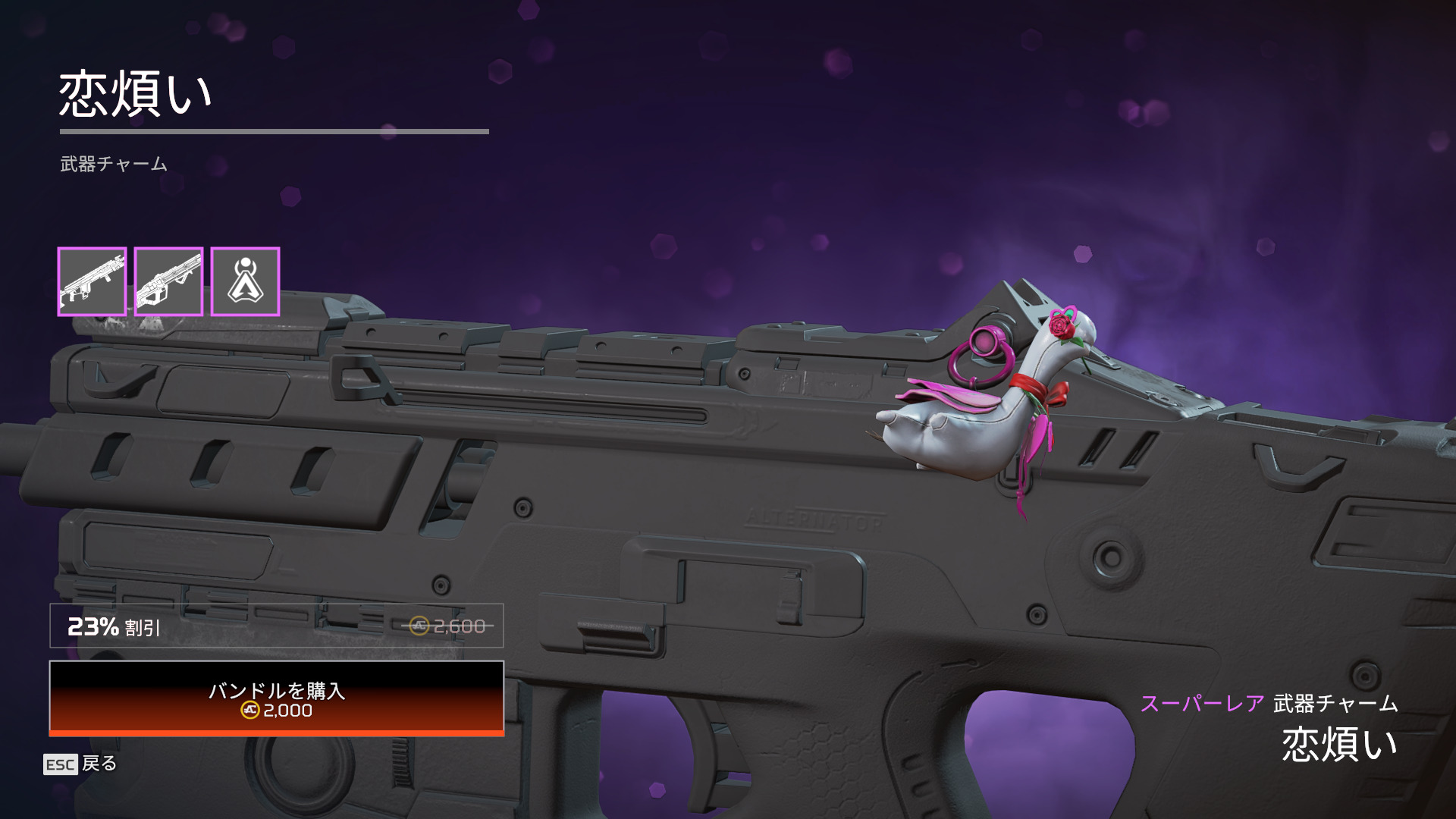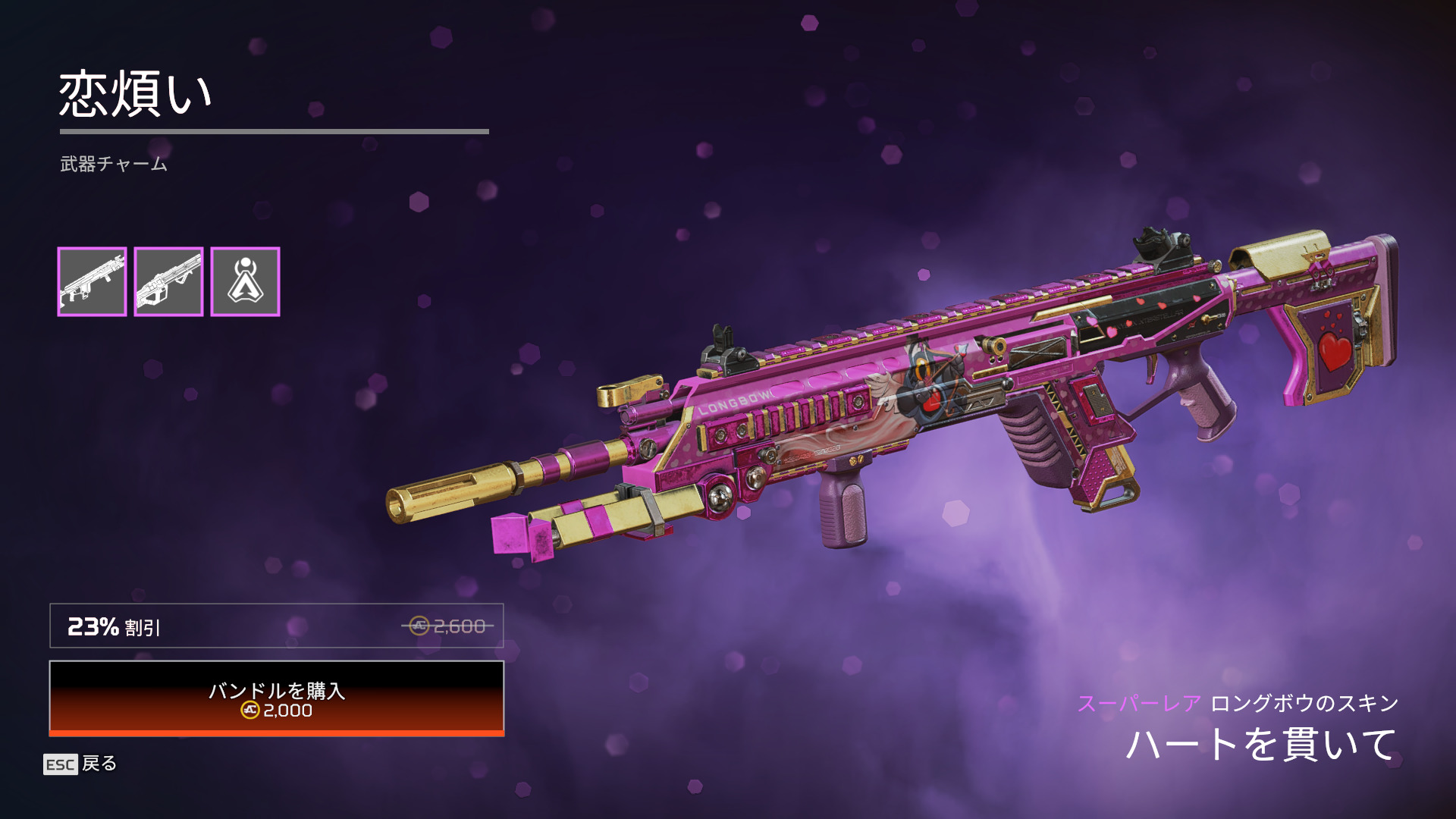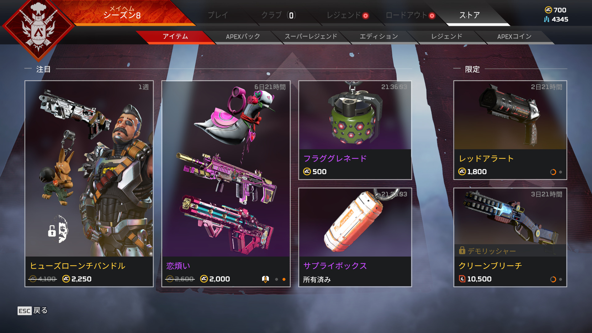 ストア情報【APEX】バレンタインデー限定アイテムがストアに登場!! 2021年2月10日 2021年2月10日最新記事 【APEX】覚醒コレクションイベント/リカラー11.12ストア情報(リーク) 【APEX】緊急修正対応が行われました(サーバー側) 【APEX】レイスのエターナルライフスキンが11.26に再販 【APEX】シーズン27開始で アクティブユーザー20万人/DAY回復 【APEX】ヴァルキリー&ホライゾンが大幅上昇!前シーズン強化のシアが1%割れ(新シーズン27開始後のピックランク) 【APEX】バレンタインデー限定アイテムがストアに登場!! エペ速管理人2月17日までの販売となります。 Facebook Twitter