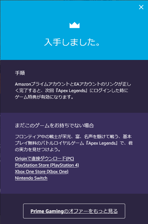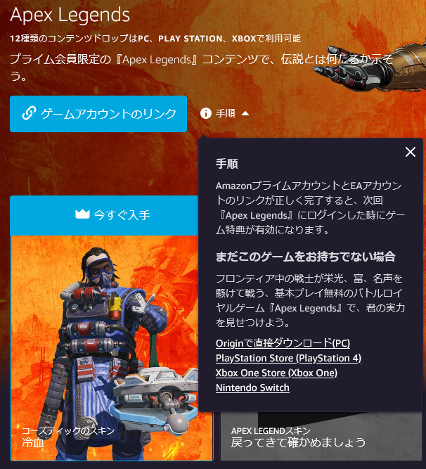 ・Twitch Primeのゲーム一覧「エーペックスレジェンズ」のページに行き「ゲームアカウントのリンクボタン」を押す。