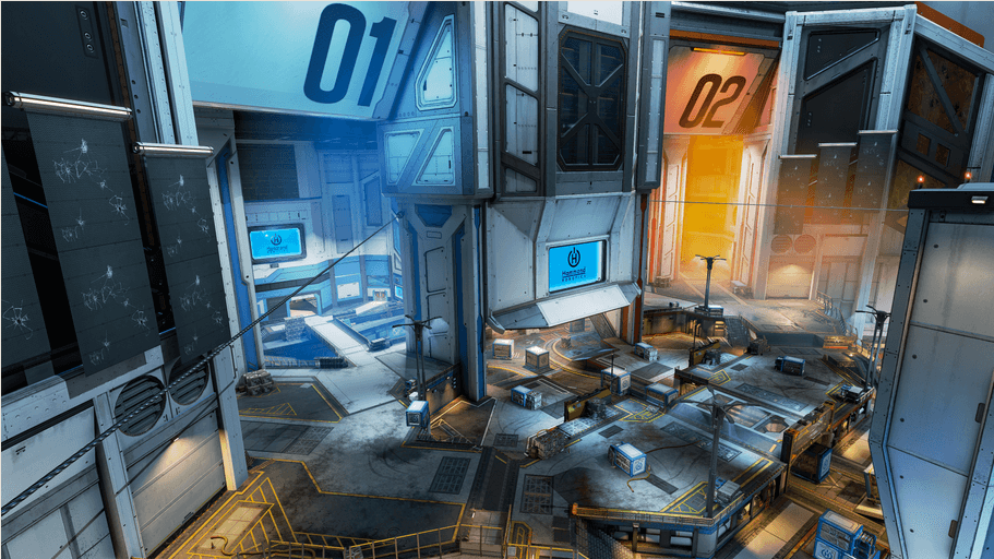 最後に積み荷場を紹介しましょう。ここは中層域に広がる2つのエリアになっていて攻撃主体のバトルが展開します。双方同時に目視できる距離にあり、コンベアで分かたれています。ここは上が開けているため、垂直移動を得意とするレジェンドが再び力を発揮できるようになります。ですが、注意すべき点も。絶景を見渡せる開けた場所なので、敵以外の危険「転落死」が待ち受けています。