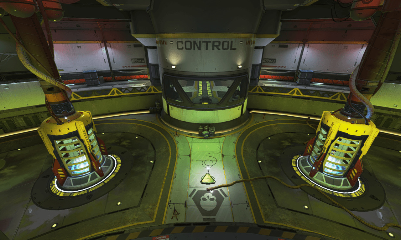 次はコンベアの説明に進みます。ここはドロップオフで最も目を引くエリアです。中層域に張り巡らされ、移動経路としても活用できる施設で展望台から見渡すことができます。マップを2つに隔てる役割もあり、最終的には積み荷場へと到達するルートになっています。荷積みを待つカーゴコンテナはこのコンベアをゆっくりと移動し、動く遮蔽物としても機能します。そのため、ここではさまざまな行動パターンが見られることになるはずです。コンテナの脇をこっそりと進み、敵チームの目から逃れることができたら?もしも、コンテナの挙動とレジェンドのアビリティを組み合わせて敵の虚を突く罠を張れるとしたら?コースティックのトラップの有効性にはもうお気づきですね?