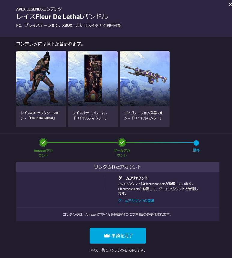 3. Twitch Prime Gamingのゲーム一覧から「エーペックスレジェンズ」のページに行き、現在配布されているアイテムを選択。その後『EAアカウントとAmazonアカウントのリンク(紐付け設定)』を行う。