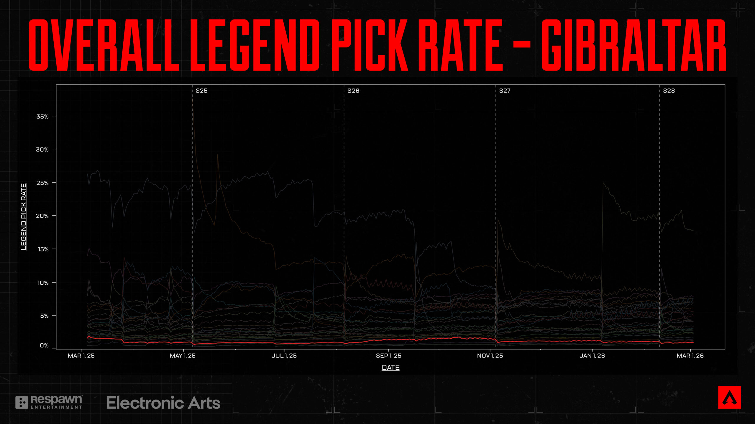 ジブラルタルは、あらゆるランクとスキルレベルにおいて、レジェンドのピック率が長らく下位に低迷しています。