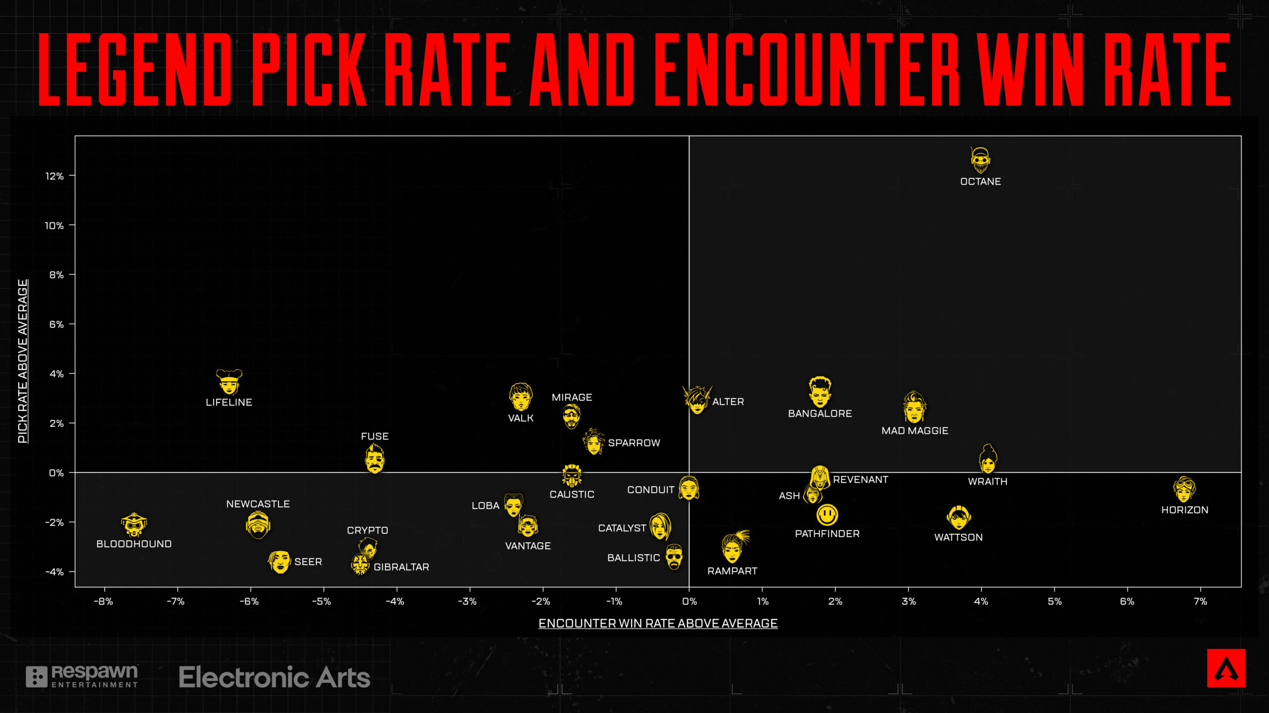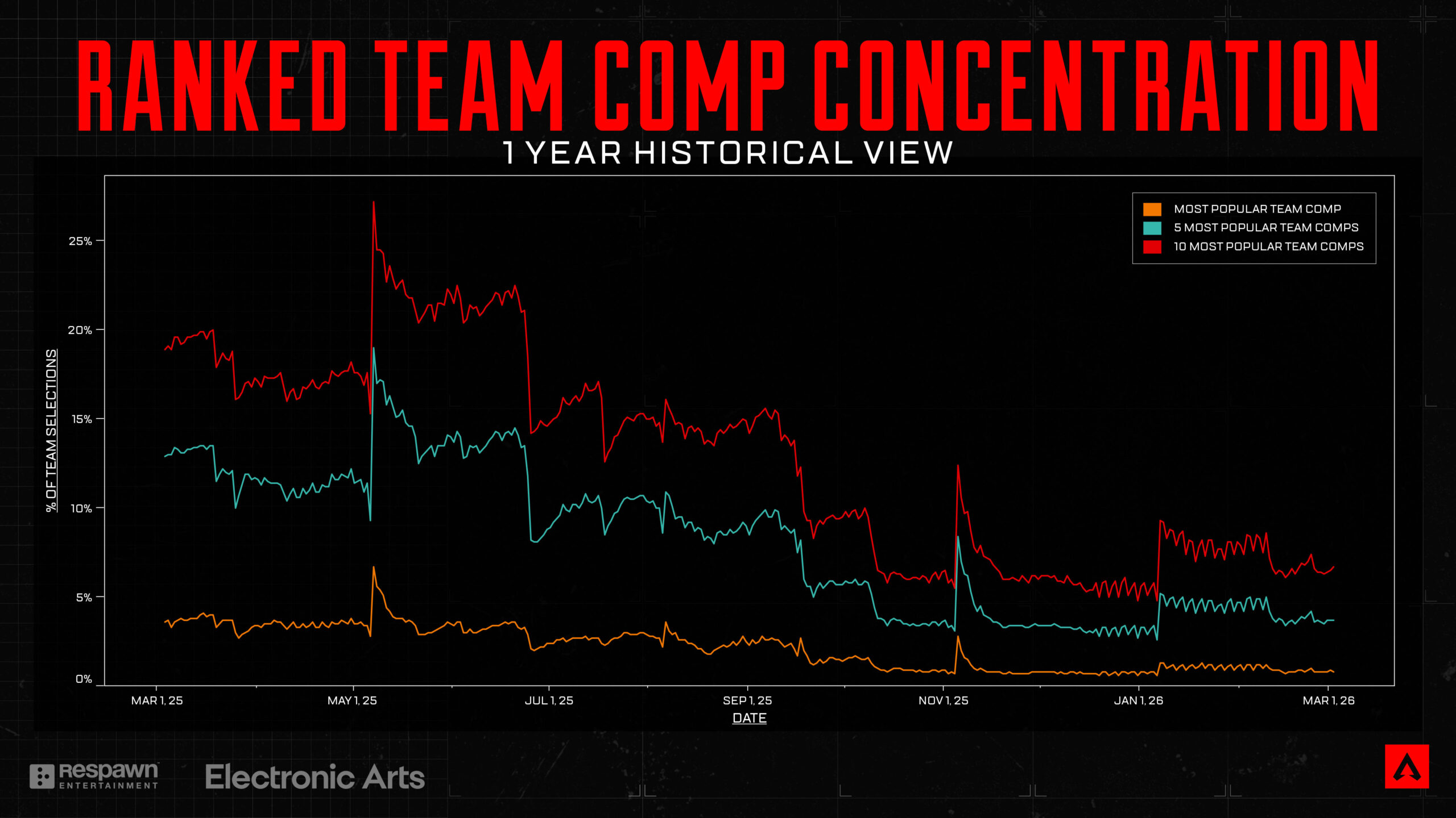 上記のグラフからもわかるように、過去12か月間、一連の大きな調整、強化、弱体化を経て、上位10、5、1位のチーム構成の集中度は劇的に低下しました。アッシュ、ヴァルキリー、オクタンなどの調整されたキャラクターはそれぞれ高いピック率を誇る時期がありましたが、過去12か月間でApexにおける「必須ピック」のデュオやトリオの存在がほぼ消滅したことを嬉しく思います。