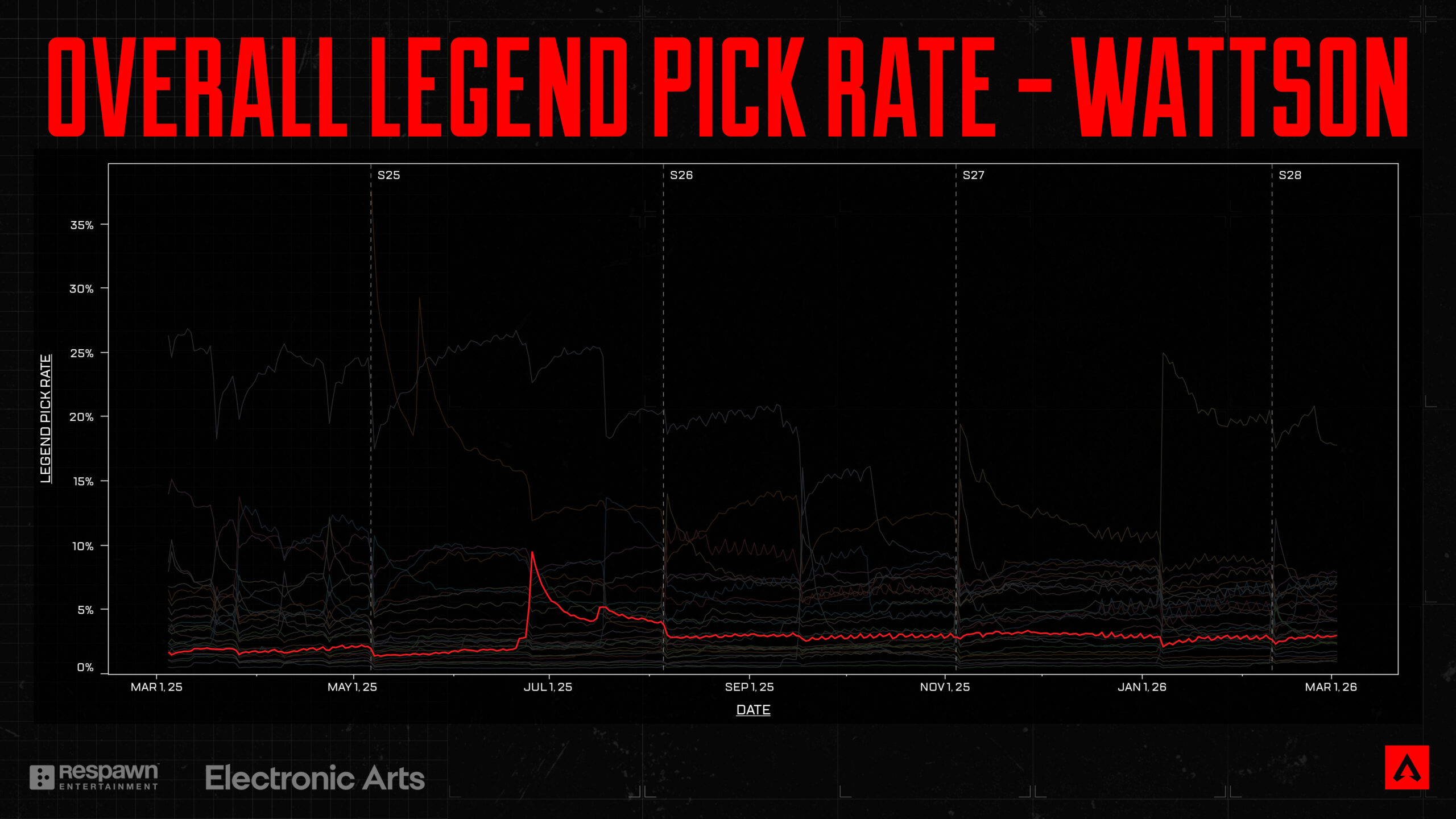2026年シーズン1の折り返し地点を迎えるにあたり、ゲームの健全性を示す指標の一つであるレジェンドチームの構成についてご紹介したいと思います。レジェンドにとって健全な状態とは、様々なチーム構成が有効な状態であるとプレイヤーが感じられる状態です。過去1年間、私たちはプレイヤーの創造性を刺激し、あるいは特定のキャラクター3人組が「必須」であるという感覚をなくすため、上位ピックされるチーム構成の支配力を意図的に抑制してきました。